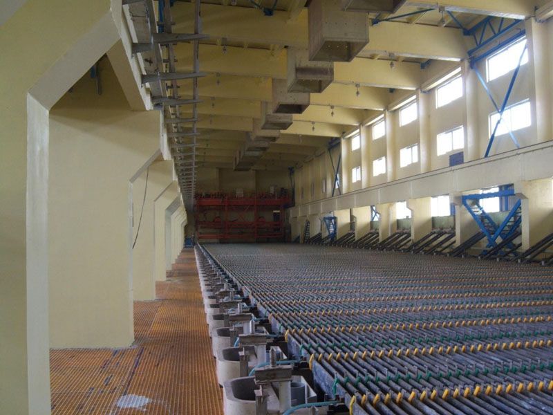 Ø The Chifeng NFC Kumba Hongye Zinc Smelting Project includes four phases with total production capacity of 230,000 t/a zinc ingot, 2,400 t/a electrolytic copper and 350,000 t/a sulfuric acid. The project production capacity takes a lead in the industry in China and the equipment is also advanced in the same scale project in China. At the same time, the project also creates a precedent in China of recovering copper from purification residue to obtain cathode copper, as well as a new profit growth point for zinc smelting enterprises. In addition, the process recovers silver from leached residue with floatation to obtain silver concentrate and recovers zinc through extraction from solution after flotation treatment, which also increased recovery of valuable metals. ENFI undertook all of the design and adopted the patent intellectual property technology of hot acid leaching -jarosite process, which is jointly owned by ENFI and Chifeng NFC Kumba Hongye Zinc Corporation. The technology is innovative in China and internationally advanced. After over 20 years, the practical production proved that the technology is sophisticated and reliable, featuring stable production, low operating costs, high rate of first class products and good economic returns. The technical and economic indicators of production management of the enterprise are among the international and domestic advanced level. The Phase IV works won the first prize of 2013 Outstanding Engineering Design Award (provincial and ministerial level), and the new technology for copper recovery from electrolyte purification residue of zinc hydrometallurgical process won a second prize in 2012 China Nonferrous Metals Industry Science and Technology Award.